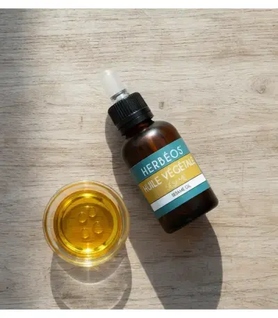 Herbeos Pure Sesame Oil is a 100% pure and natural vegetable oil in a 30ml bottle that provides deep moisturizing for skin and hair. This versatile beauty oil strengthens, nourishes, and protects with antioxidant benefits. Perfect for daily skincare routines, hair treatments, and massage therapy. Discover the natural solution for radiant wellness.