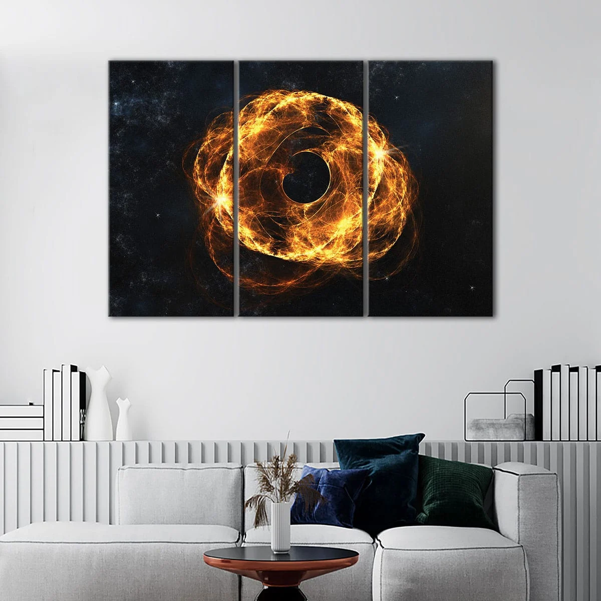 Our Black Hole In Fire wall art is the perfect addition to any room, offering a range of options to suit your style and space. Choose from 1 panel, 3 panels, or 5 panels, available in various sizes from small to oversized canvas prints. This artwork is perfect for your living room, hallway, kids room or dining room, making it an ideal conversation starter and decorative piece.