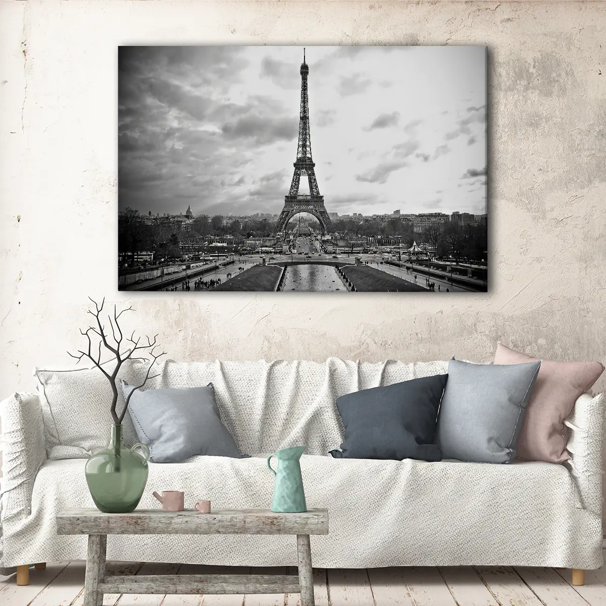 This Eiffel Tower wall art is available in multiple options: 1 panel, 3 panels, or a 5-panel masterpiece. Our prints come in a range of sizes: from small to oversized, ensuring it can fit seamlessly into your living room, hallway, kids' room, or dining room.