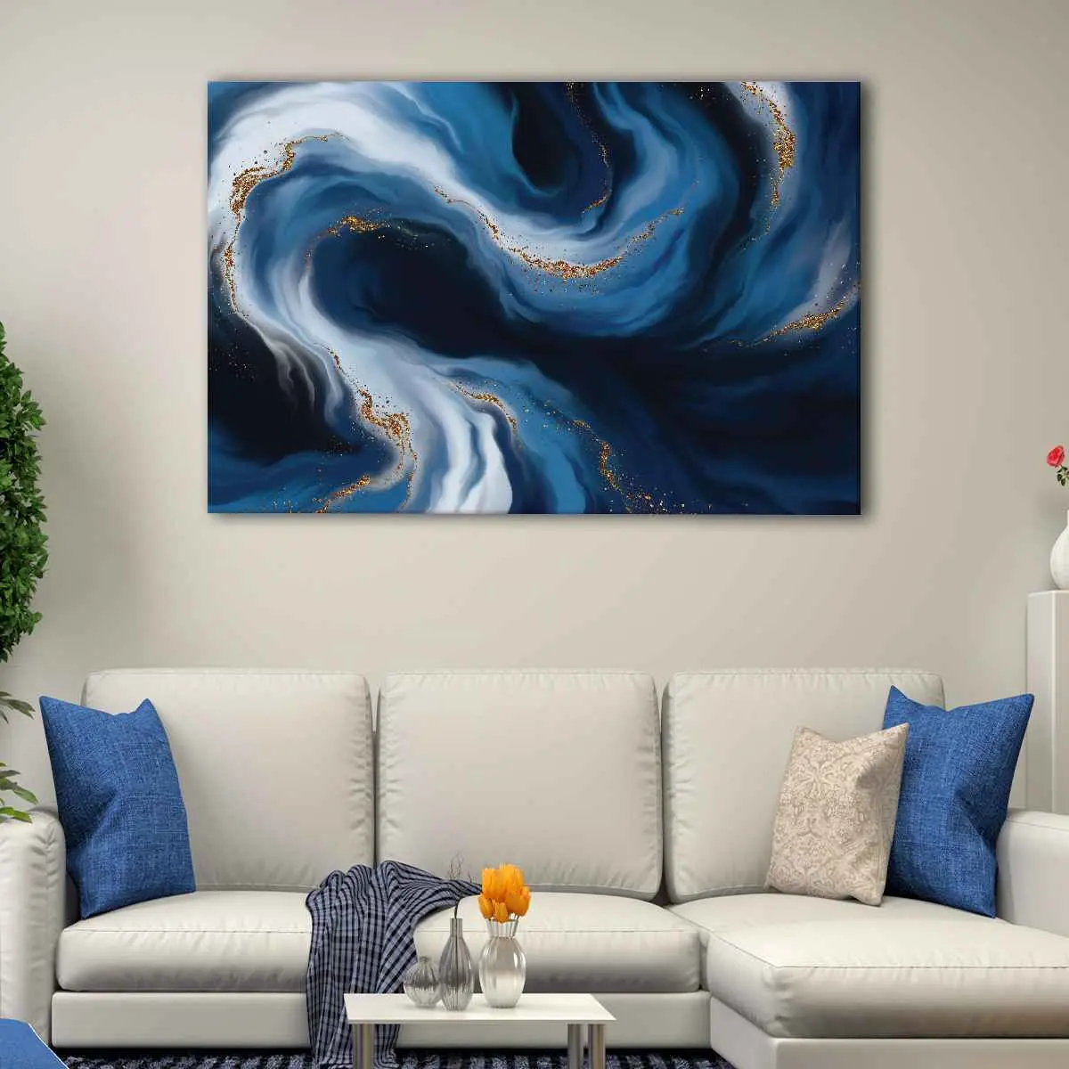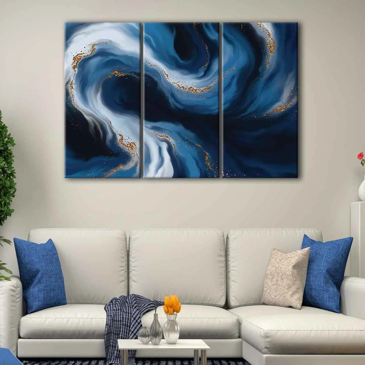 The stunning Blue And Gold Waves canvas art arrives ready to hang, requiring no additional framing. Skilled craftsmen carefully hand-stretch the premium poly-cotton canvas over 100% natural wood stretcher bars. This ensures high-definition prints with vibrant colors that will last for over 100 years.