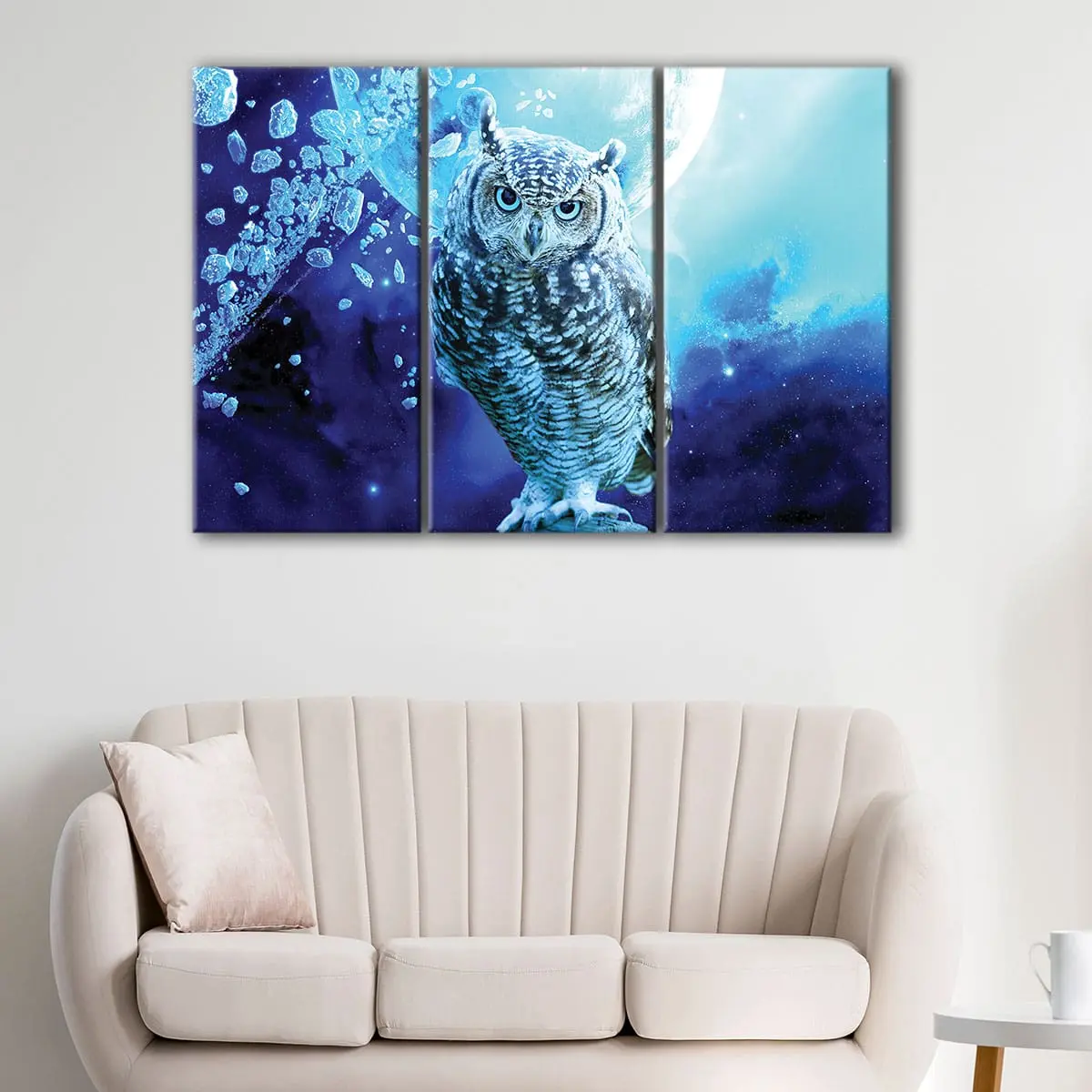 The blue owl canvas is available in multiple panel combinations: single panel, 3 panels, and 5 panels. You can also choose from a variety of sizes to suit your living space, whether it's a small area or a large room in your home, such as your living room, hallway, kids room, or dining room.