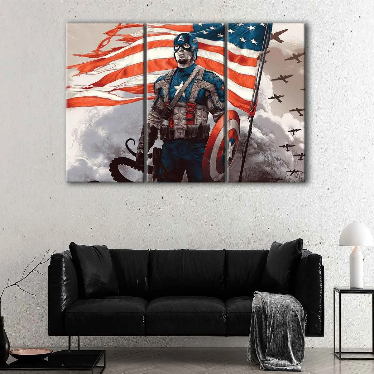 The Captain America Painting canvas art is a stunning piece of wall decor that will elevate the style and theme of any room. It comes ready-to-hang with metal saw-tooth hangers on the back, eliminating the need for additional framing. The canvas is carefully hand-stretched over 100% natural wood stretcher bars by our expert craftsman.