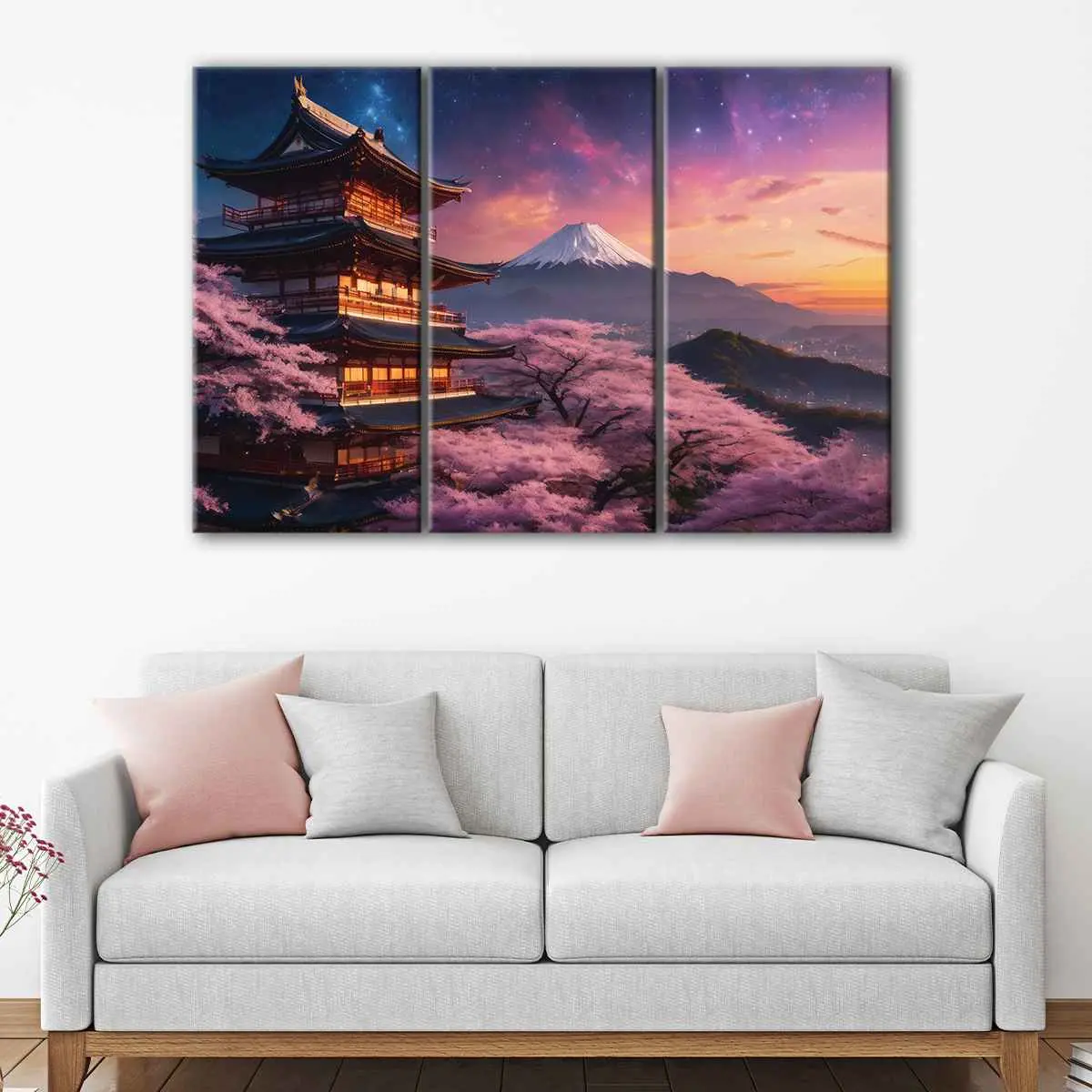 This stunning Cherry Blossom Temple canvas art comes ready-to-hang with metal saw-tooth hangers on the back, requiring no additional framing. The canvas is carefully hand-stretched over 100% natural wood stretcher bars by our skilled craftsmen. We combine premium poly-cotton canvas with pigment-archival inks to offer you high-definition prints with really vivid colors that last for 100+ years.