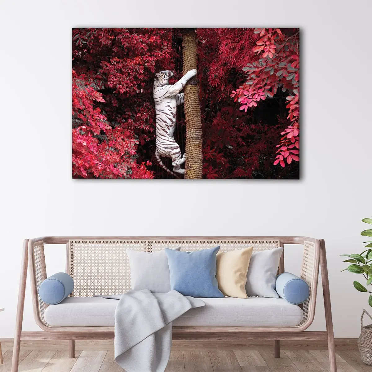This striking tiger in pink forest artwork makes an ideal gift for birthdays, anniversaries, or for those who love animals. Give the gift of love and beauty to your surroundings by presenting this stunning tiger canvas wall art. Buy this unique piece available for sale at tourathy.com and spread love and elegance in your home.