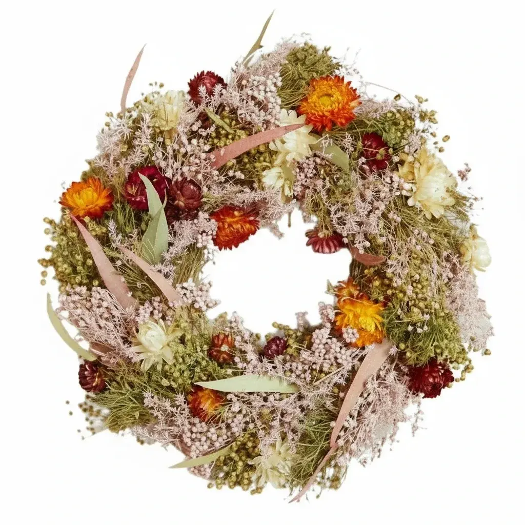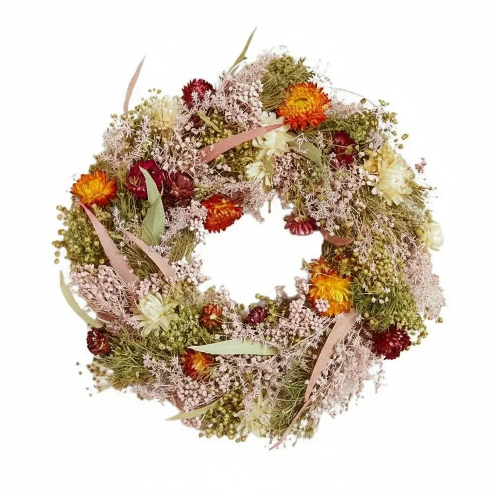 Introducing our exquisite Multi Color Dried Flower Wreath, a permanent piece of nature's artistry for your home. Unlike fresh flowers that wilt, this beautifully crafted wreath maintains its vibrant multi-color palette year-round, bringing enduring beauty to any space without the need for water or maintenance.
