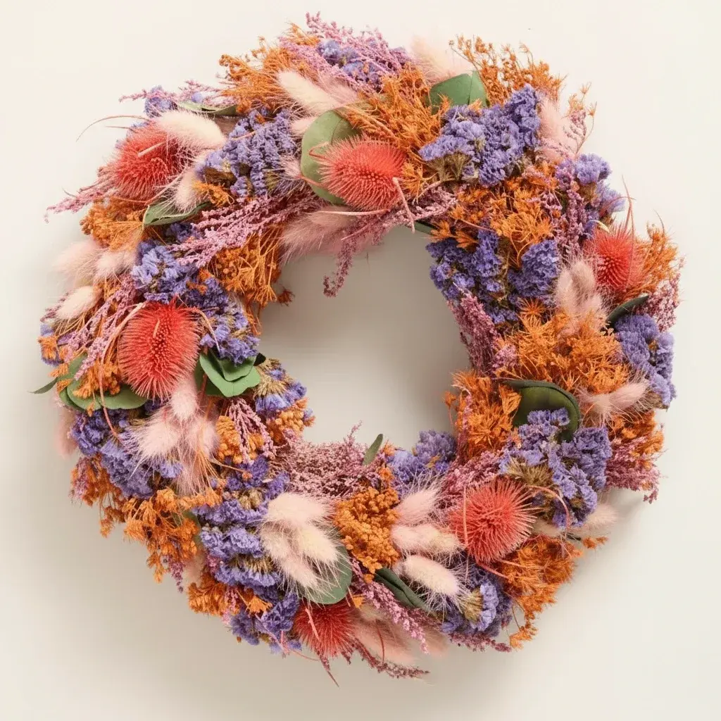 Each wreath is meticulously assembled using a selection of high-quality dried flowers and natural materials. The composition features a harmonious blend of textures and earthy tones, creating a visually appealing focal point. The simple, elegant design ensures it seamlessly integrates with your existing decor, adding a touch of organic style to any room, front door, or wall space.