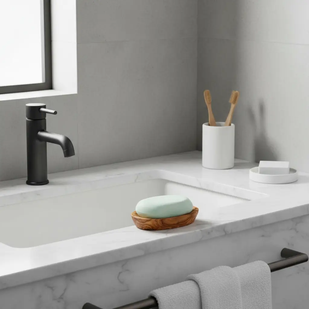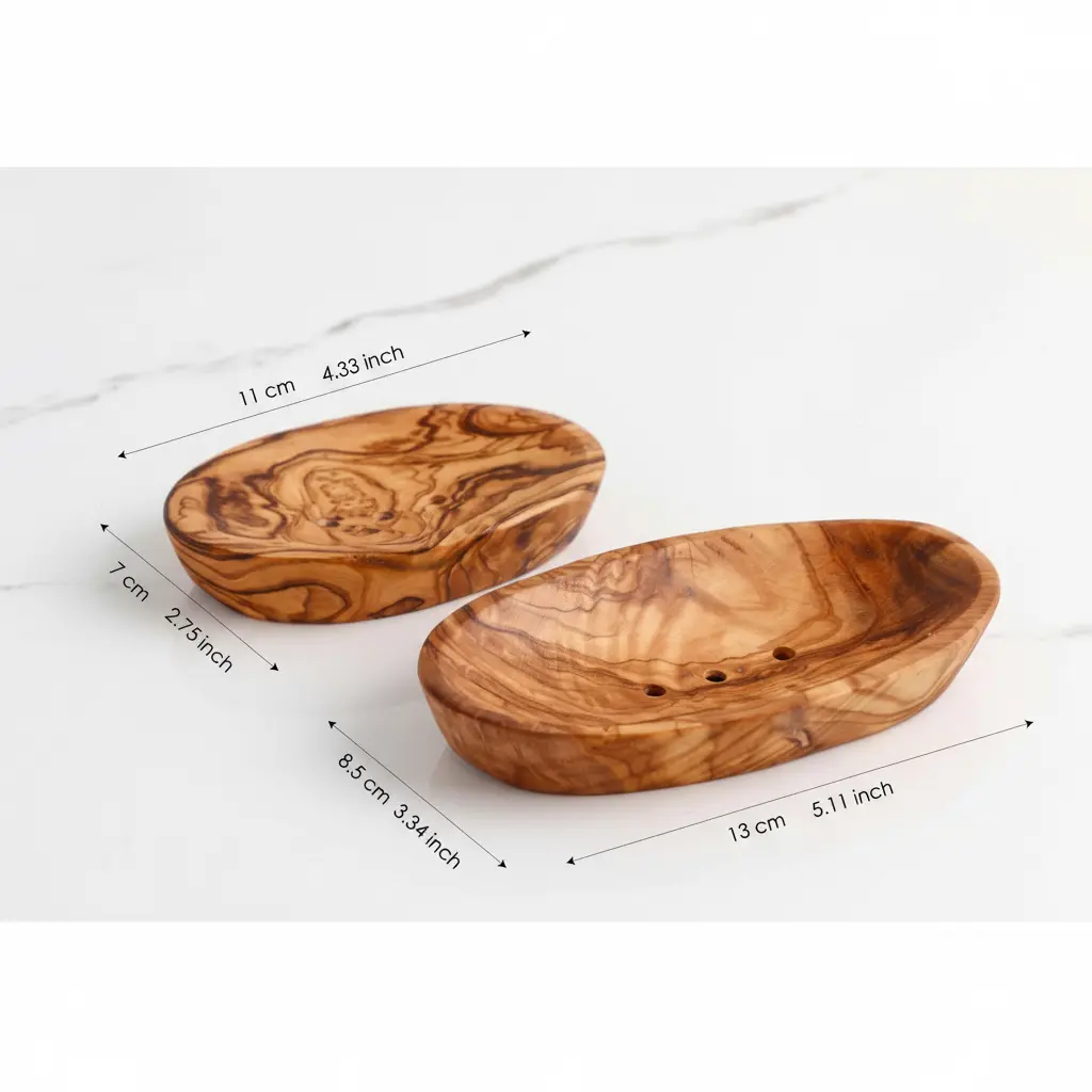 This beautiful olive wood soap dish is expertly handmade in Tunisia using traditional artisan techniques. Each piece is crafted from solid olive wood, showcasing the unique natural grain patterns that make every dish one-of-a-kind. The sustainable design reflects generations of woodworking expertise, creating a product that combines beauty with environmental consciousness.