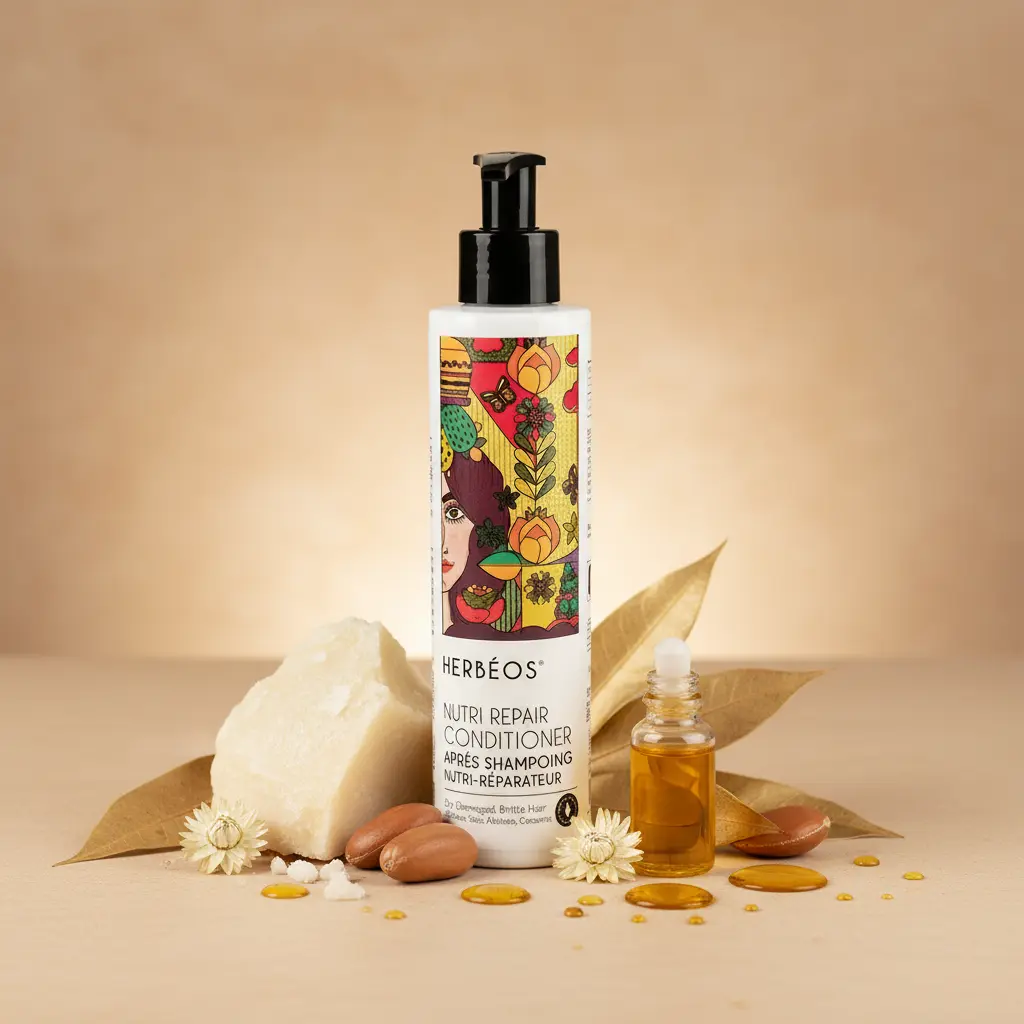 Herbeos Nutri Repair Conditioner is a professional-grade deep-conditioning treatment specifically formulated for dry, damaged hair. This advanced hair care product features the innovative Nutri-Repair formula that works to mend split ends while restoring essential moisture to your hair strands. The 200ml bottle provides ample product for consistent use, delivering long-lasting care that transforms your hair from brittle and damaged to soft, manageable, and visibly healthier with each application.