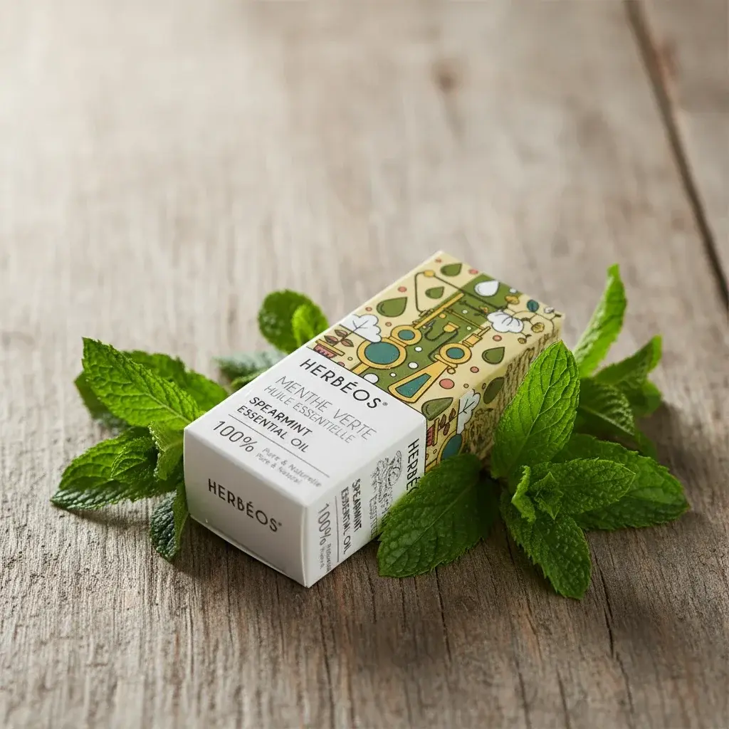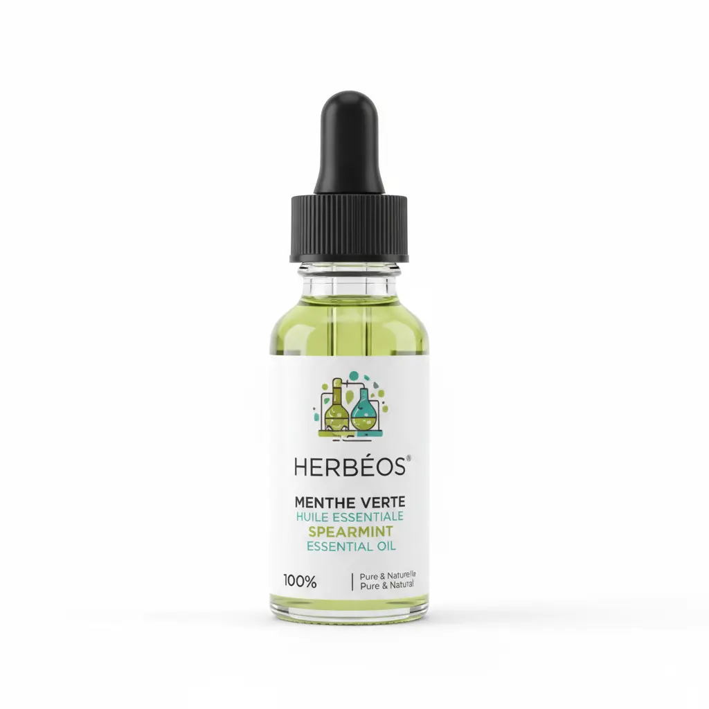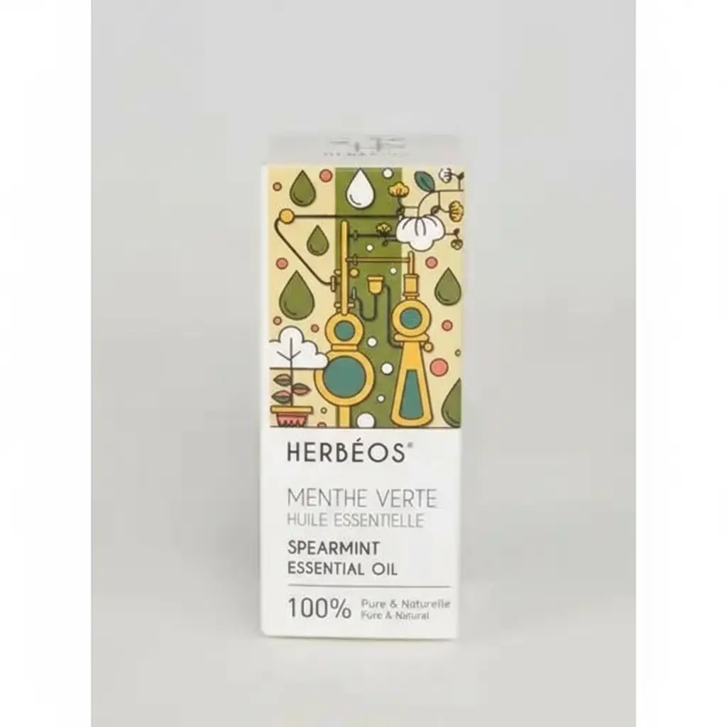Herbeos Spearmint Essential Oil For sale. This 5ml bottle contains 100% pure and natural spearmint essential oil, perfect for aromatherapy and DIY projects. The oil is derived from high-quality sources to ensure maximum potency and therapeutic benefits. It's a versatile addition to any natural wellness toolkit, designed to invigorate your senses and purify your living space.