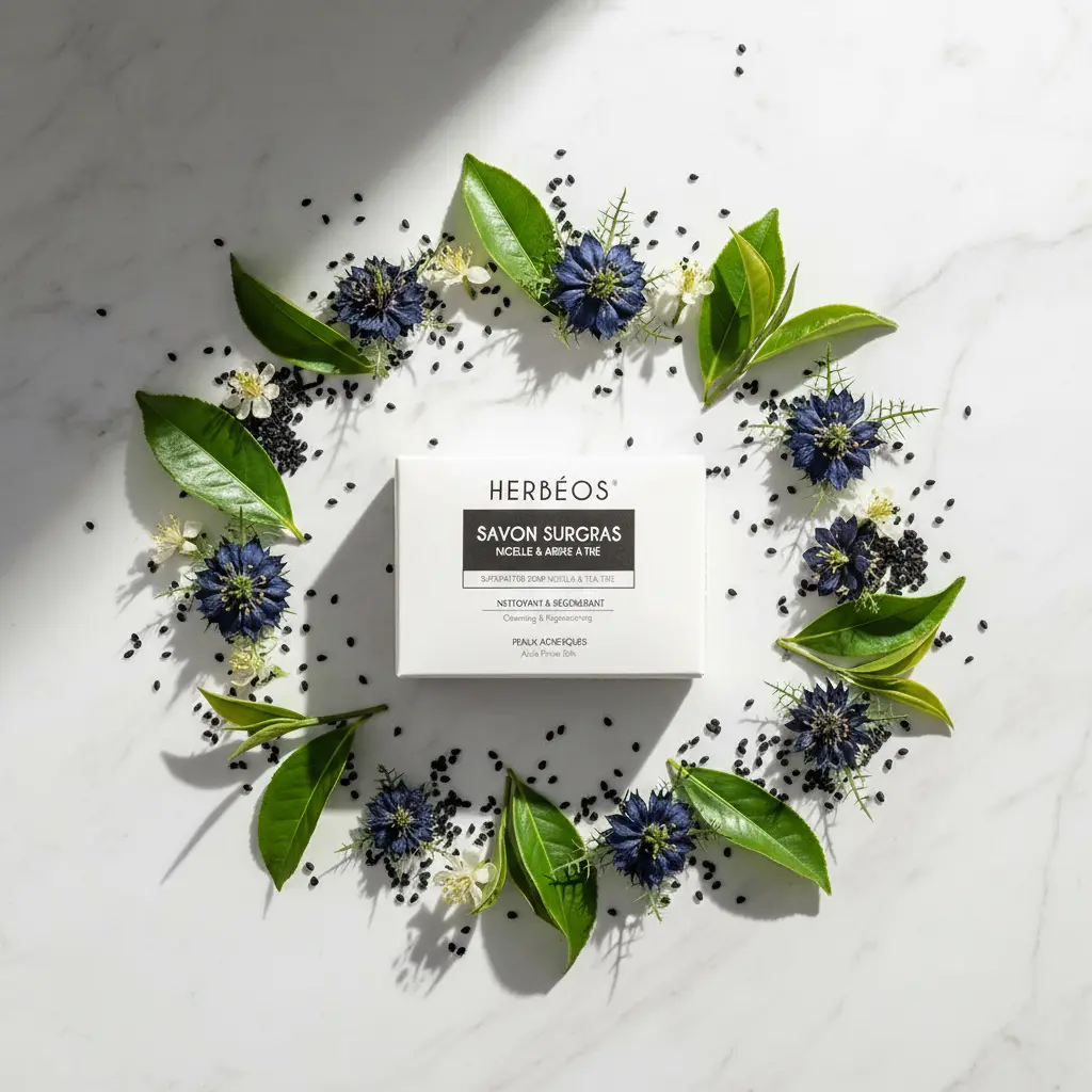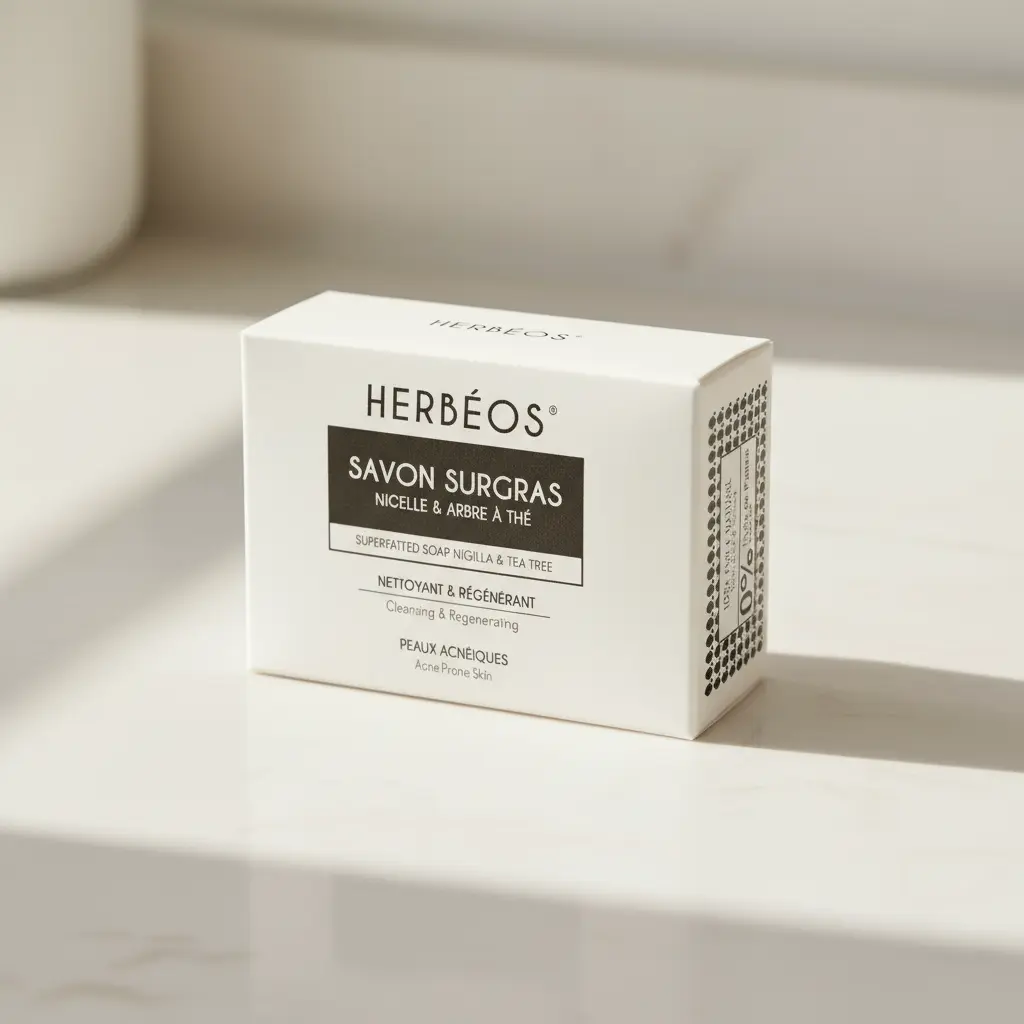 Herbeos Purifying Superfatted Soap delivers deep cleansing action specifically formulated for acne-prone skin. The unique nigella and tea tree formula works to combat impurities while maintaining your skin's natural moisture balance. This regenerating cleanser effectively removes dirt and excess oil without stripping essential hydration, leaving your skin feeling fresh and revitalized after each use.