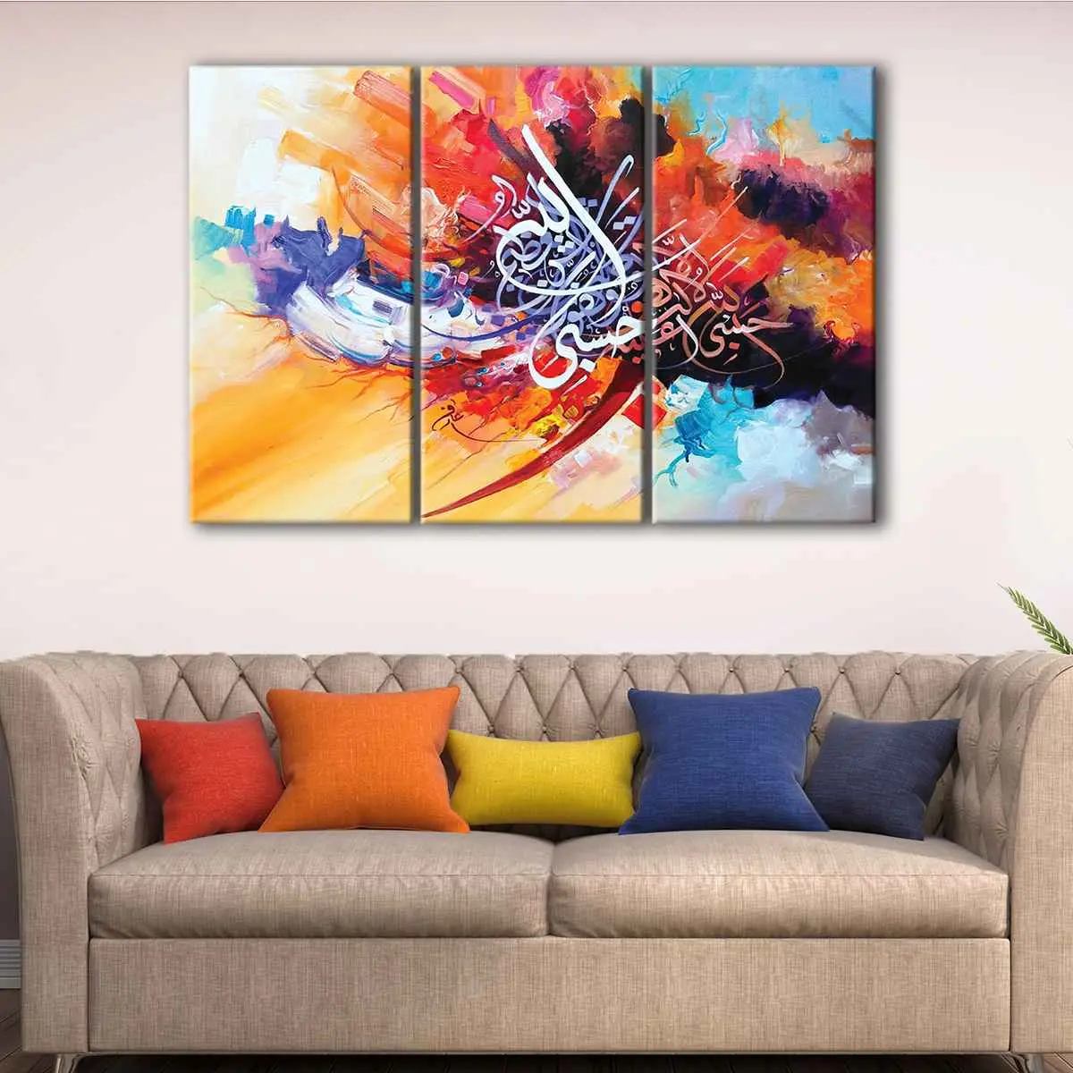 Adorn your living space with our exquisite Islamic Calligraphy canvas art, expertly crafted with premium poly-cotton canvas and pigment-archival inks. This beautiful wall art boasts vibrant colors that will last for over 100 years, guaranteeing a stunning visual impact in your home.