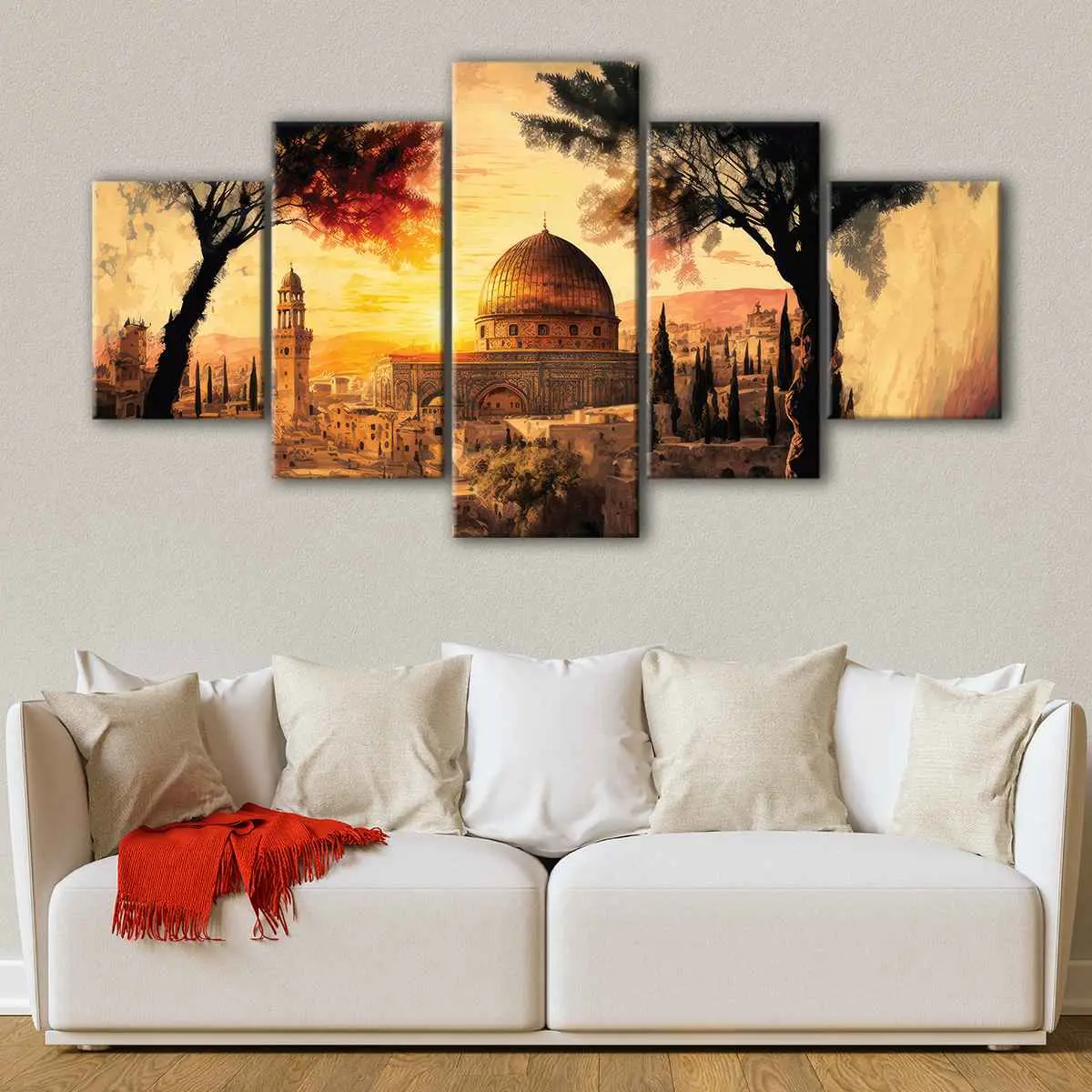 This beautiful Jerusalem painting wall art is available in various configurations to suit your unique style and decor. Choose from a single panel or a multi-panel setup, each carefully hand-stretched over 100% natural wood stretcher bars by our expert craftsman. Your stunning cityscape artwork is ready to hang, with no additional framing required, and features premium poly-cotton canvas combined with pigment-archival inks to ensure bright, vivid colors that will last for over 100 years.