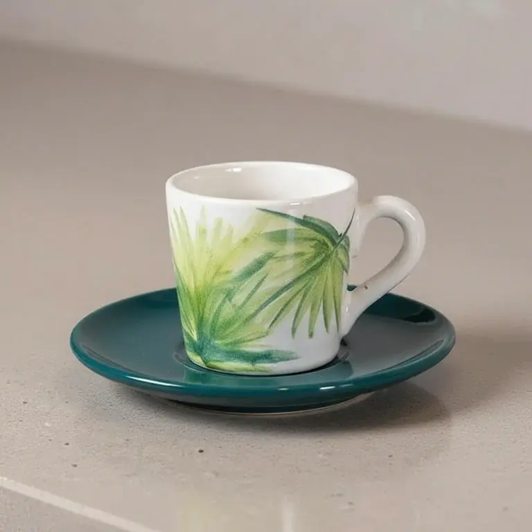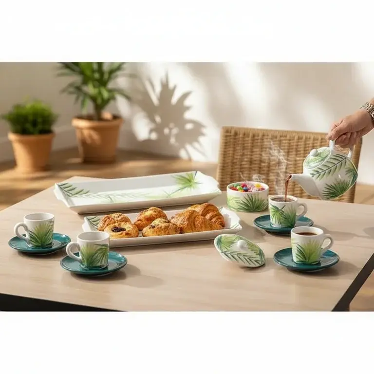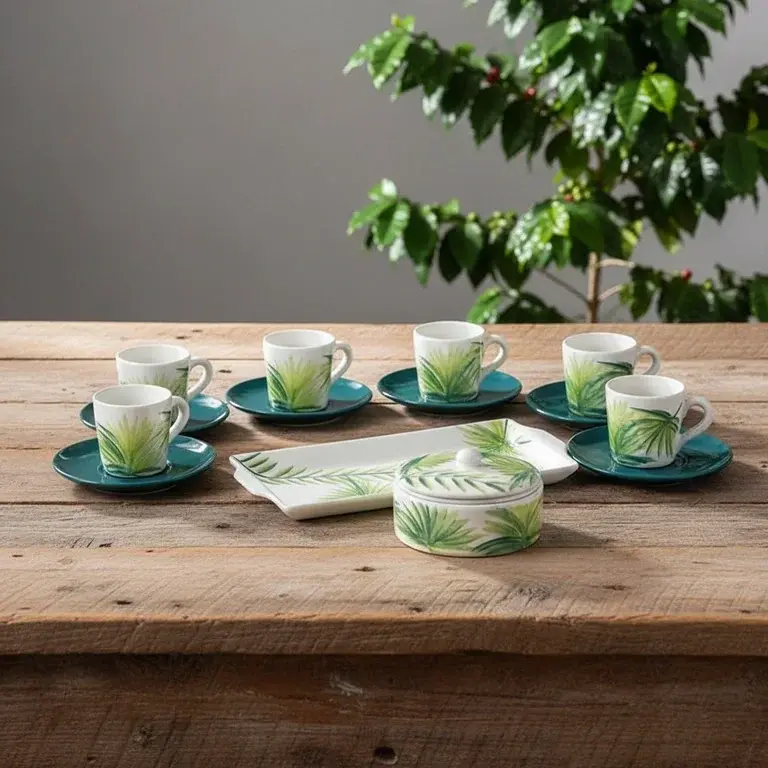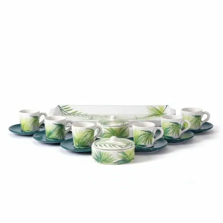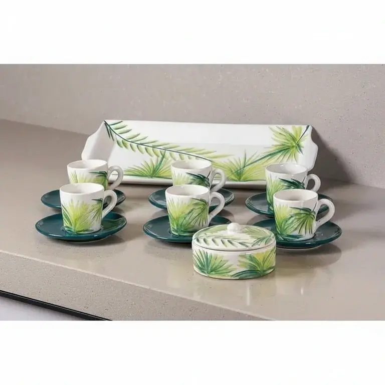 Transform your daily coffee ritual into a serene experience with the LEAF pottery coffee set from Ceramica Plus. This 15-piece ensemble is designed for both beauty and function, featuring a delicate green leaf pattern that brings a whisper of nature to your table. Crafted with care, each piece showcases the unique, tactile quality of hand-finished pottery, ensuring no two sets are exactly alike.