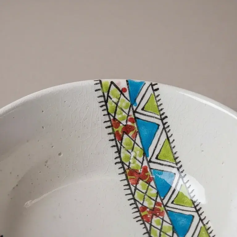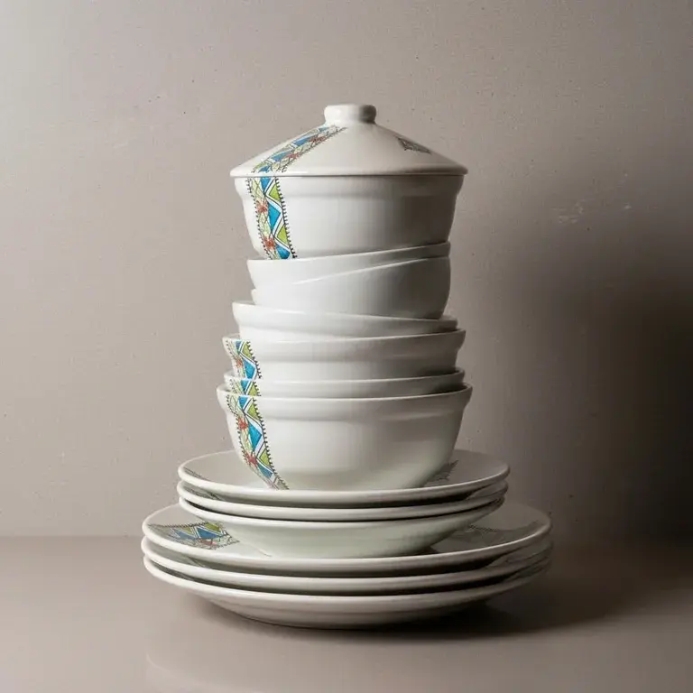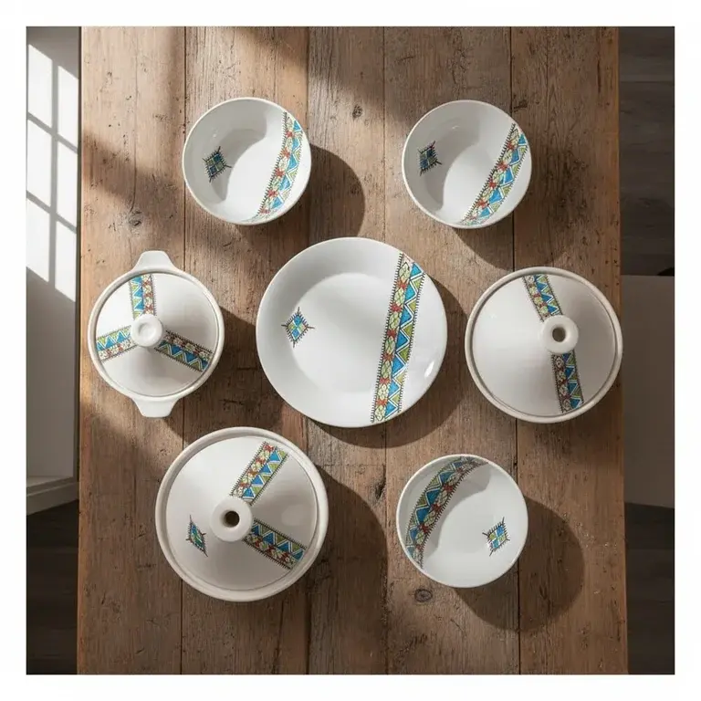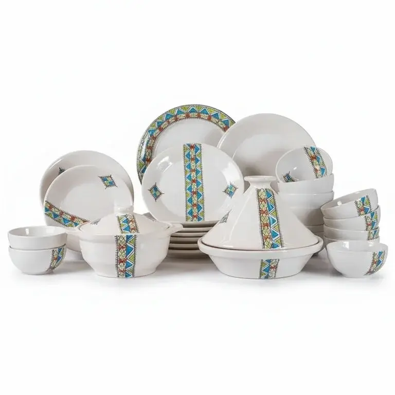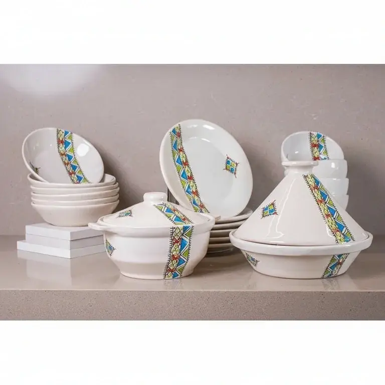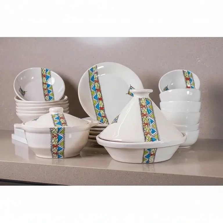 This comprehensive 22-piece set provides everything you need for a full table setting. It includes 6 versatile bowls, 6 deep plates, 6 flat plates, a practical soup tureen, a traditional tagine pot, and 2 matching lids. Each piece is a testament to skilled pottery work, finished with a unique, colorful design that stands out.