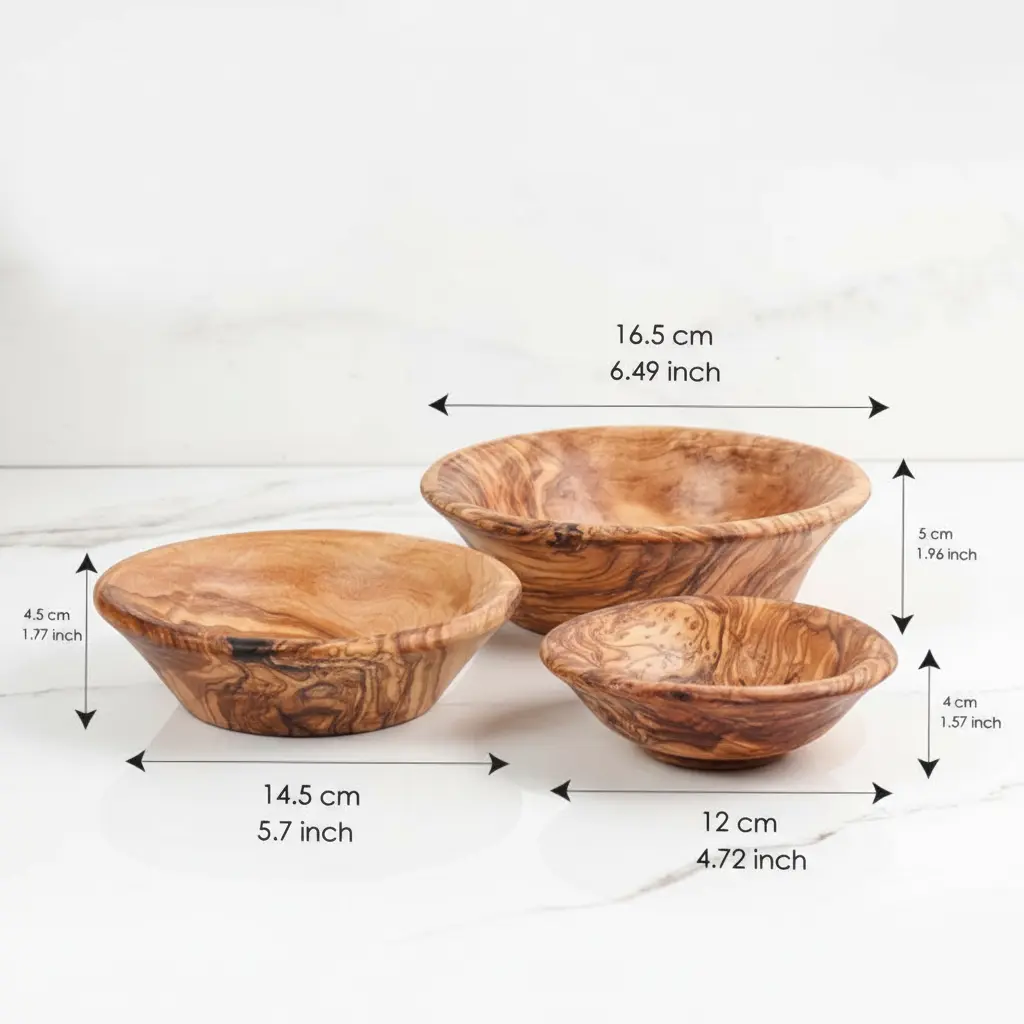 The space-saving nested design makes these bowls ideal for any kitchen, providing multiple serving sizes while occupying minimal storage space. Perfect for serving fruits, nuts, snacks, or as decorative display pieces, these bowls offer both practical utility and artistic appeal. The smooth, finished surfaces are easy to clean and maintain, while the durable olive wood construction ensures long-lasting beauty and functionality.