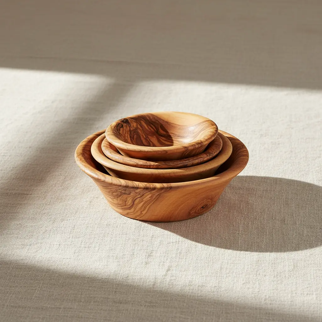 Handmade from solid olive wood, these beautiful nesting bowls showcase exceptional artisan craftsmanship. Each piece is carefully carved to highlight the natural grain patterns, ensuring no two bowls are exactly alike. The warm, rich tones of the olive wood create elegant home decor that complements any dining setting. These bowls represent the perfect blend of traditional woodworking techniques and contemporary design aesthetics.