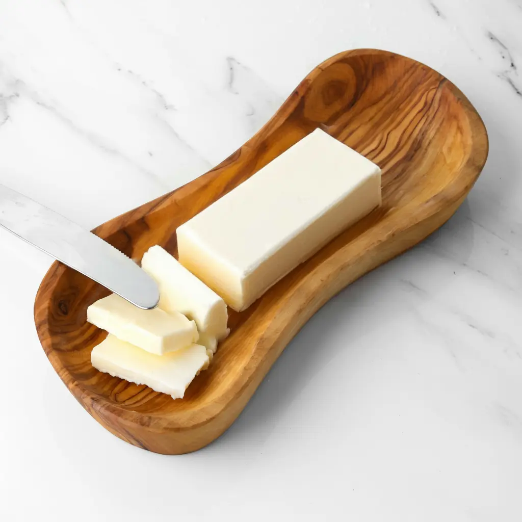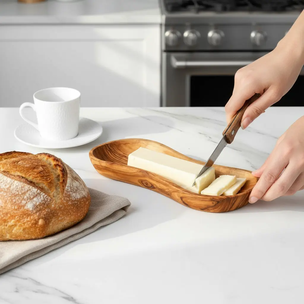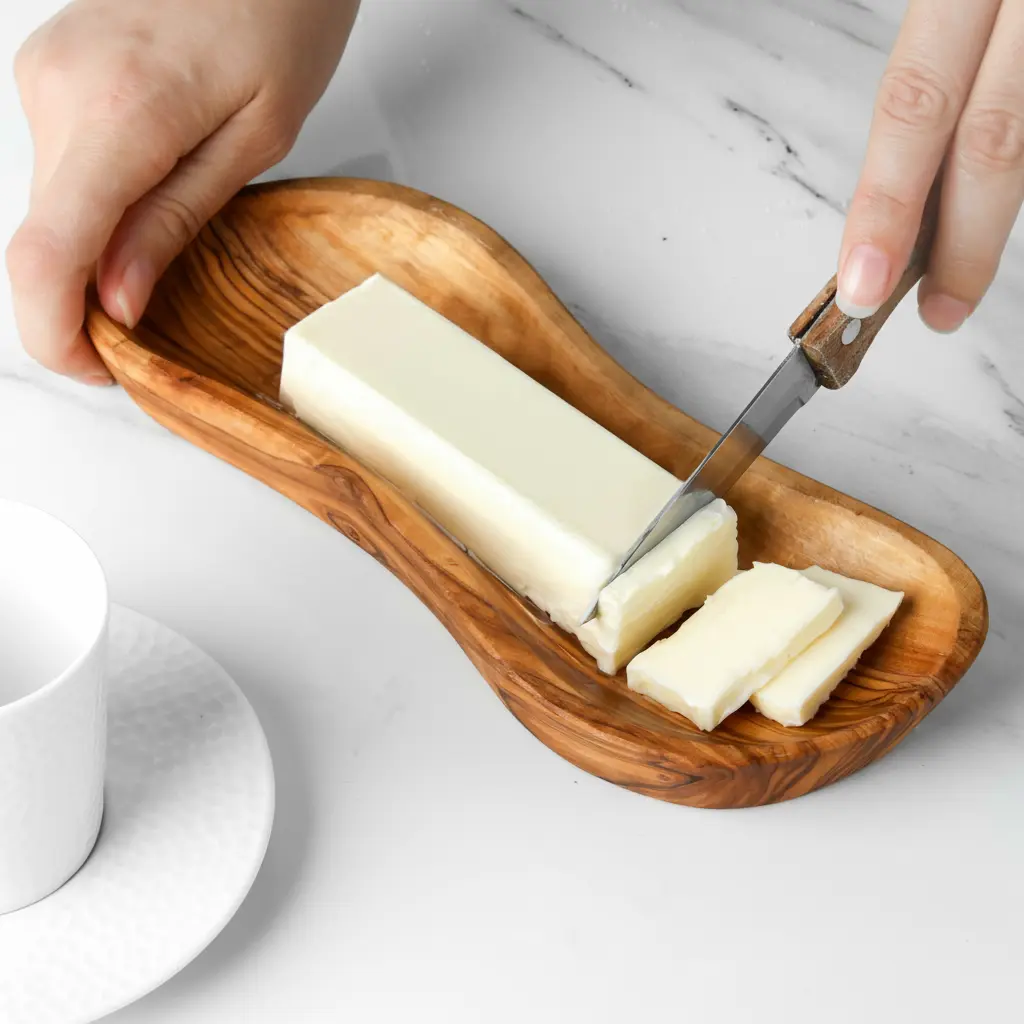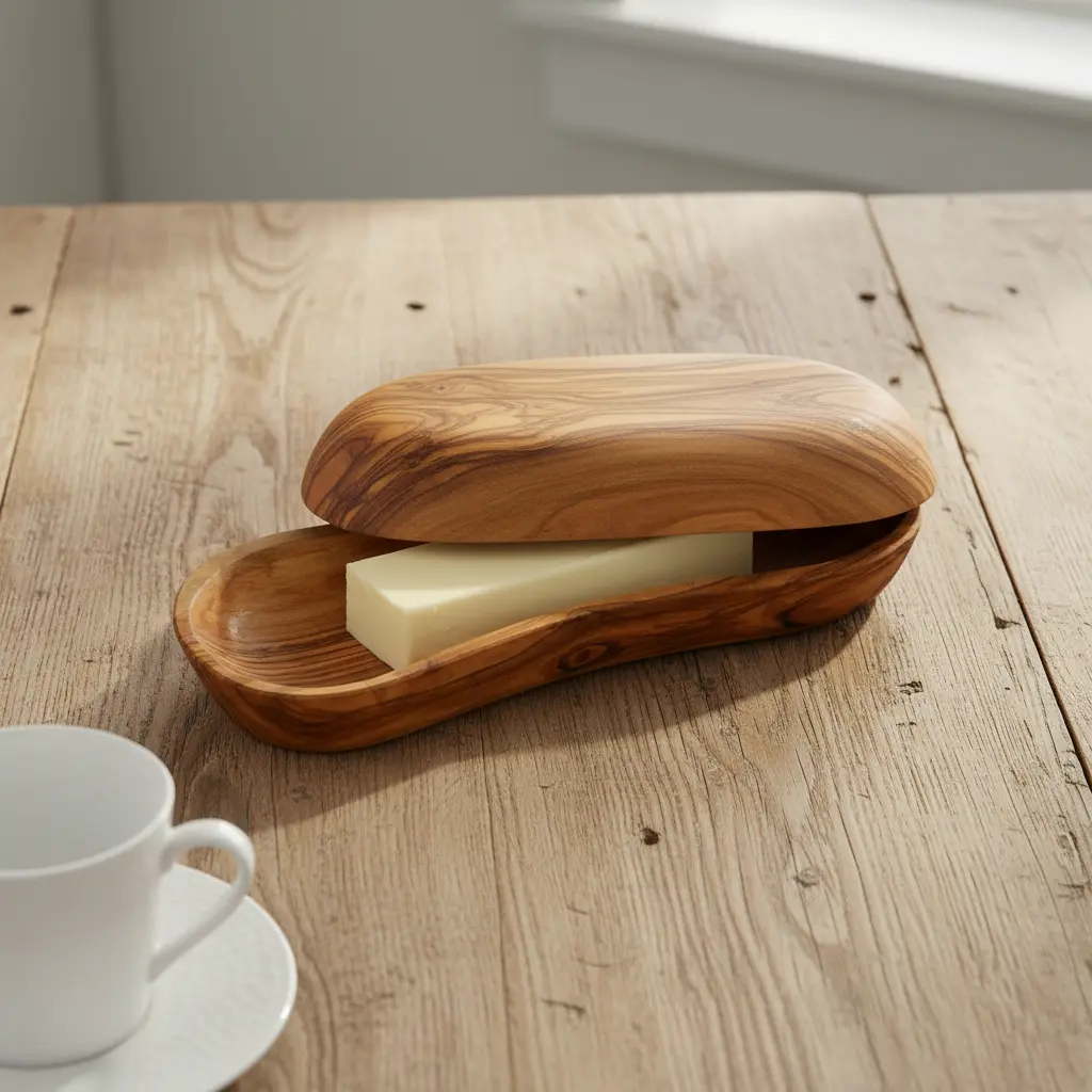 This beautiful butter dish is meticulously handcrafted from solid olive wood, combining natural elegance with practical everyday use. Each piece showcases the unique grain patterns and warm tones characteristic of olive wood, making every dish one-of-a-kind. The natural properties of olive wood help maintain butter at the ideal spreadable consistency while adding rustic charm to your dining table. Perfect for both casual family meals and formal entertaining occasions.