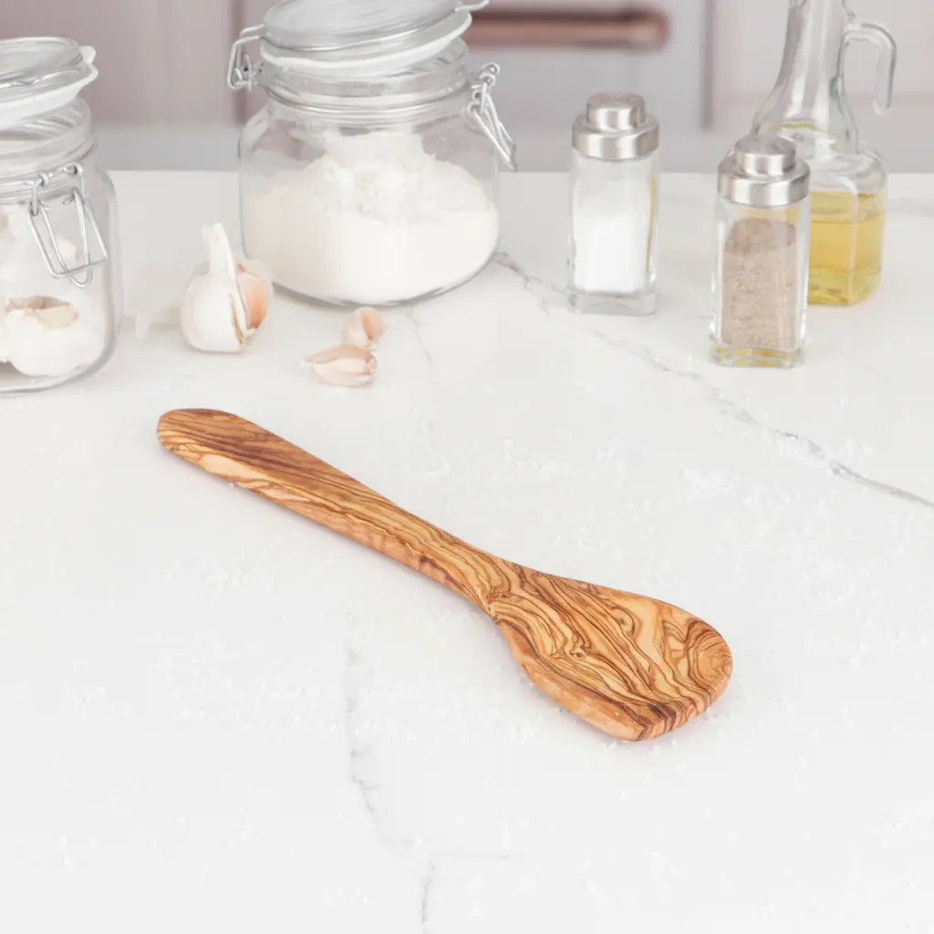 This corner spoon serves as an essential kitchen utensil for all your stirring and scraping needs. Made from durable olive wood that's naturally gentle on pans, it won't scratch or damage your cookware surfaces. The ergonomic handle provides comfortable grip and control, while the angled head makes it perfect for getting into tight corners of pots, pans, and mixing bowls.