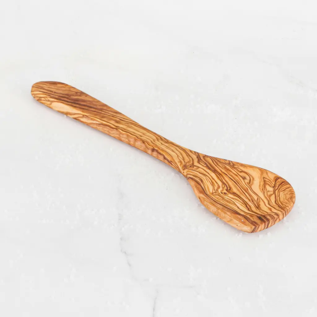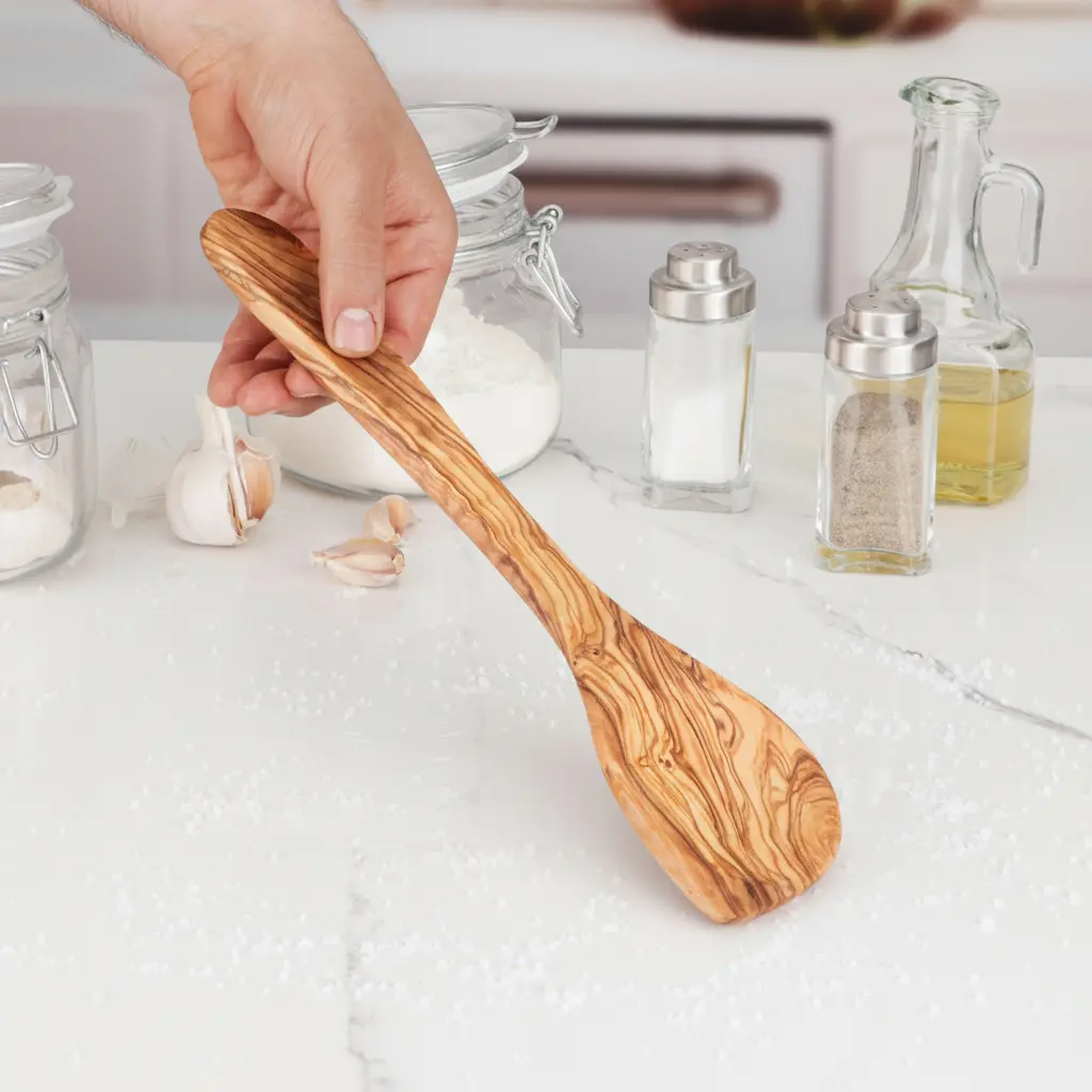 Discover this unique handmade wooden cooking spoon, expertly crafted from natural olive wood. Each spoon showcases the beautiful, natural grain patterns of olive wood, making every piece one-of-a-kind. The special angled design is specifically engineered to reach every corner of your cookware, ensuring no food gets left behind during cooking preparation.