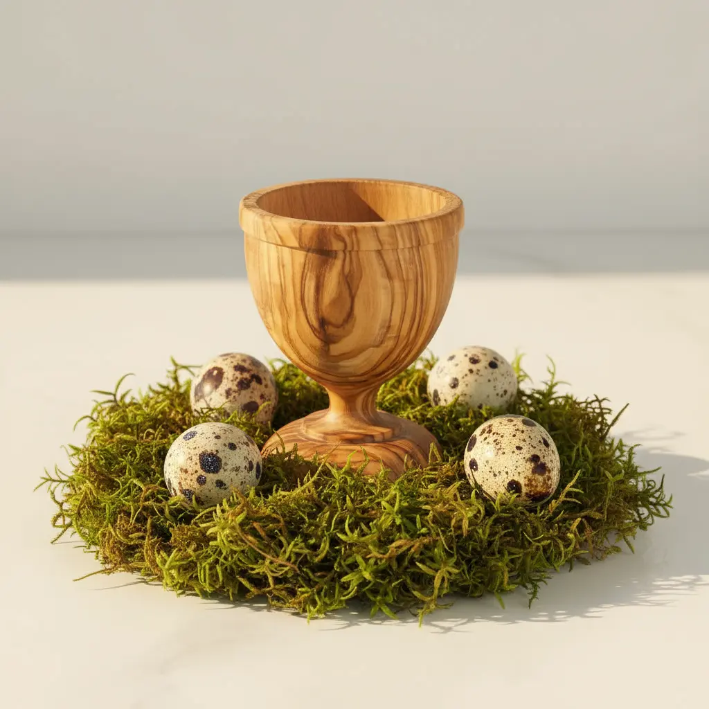 Discover Artisraw's beautifully handcrafted olive wood egg cup, a unique piece of serveware designed specifically for your Easter table celebrations. Each cup is meticulously carved from solid olive wood, showcasing the wood's beautiful natural grain patterns that make every piece truly one-of-a-kind. The sustainable nature of olive wood makes this functional decor item an environmentally conscious choice for your holiday table settings.
