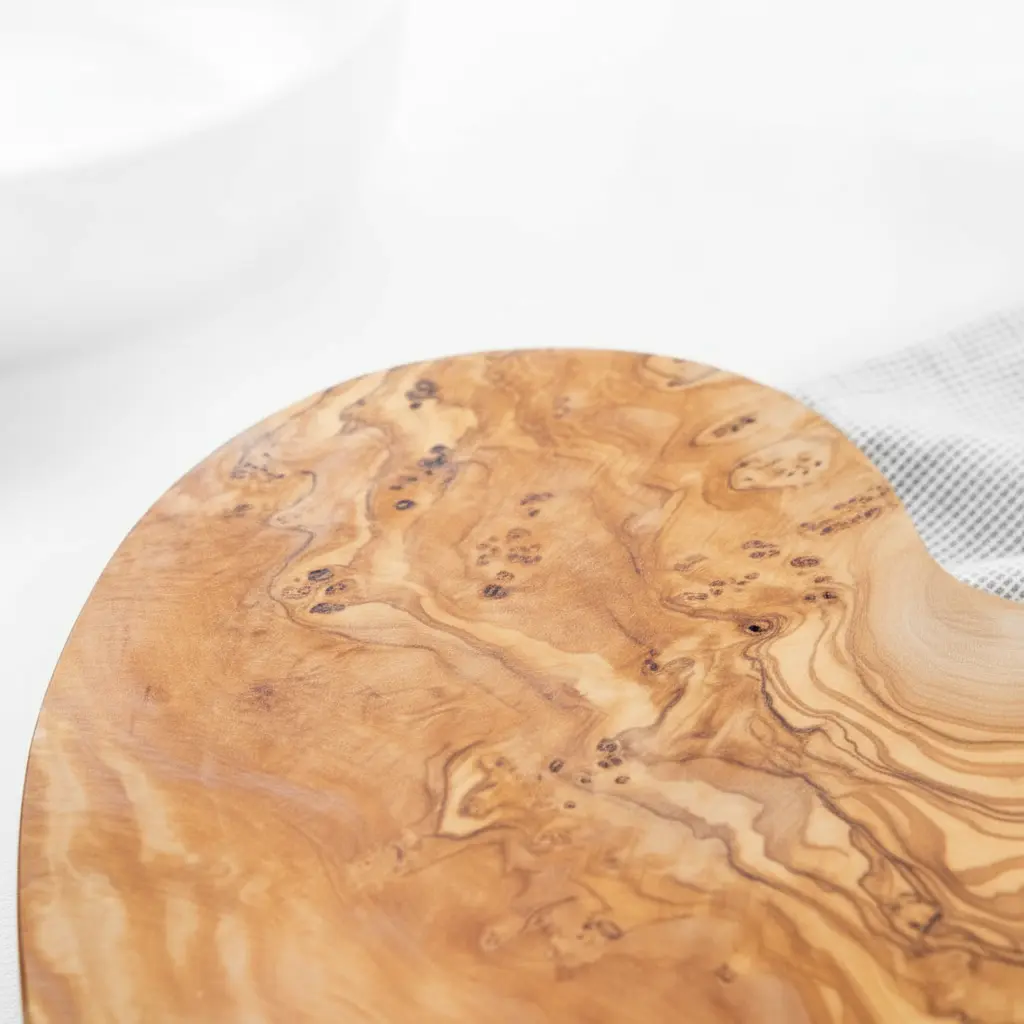 Each board is carefully handcrafted to highlight the natural beauty of olive wood, ensuring no two pieces are exactly alike. The wood's natural oils provide inherent antibacterial properties while creating a surface that is gentle on knives. Available in two sizes to accommodate different serving needs, this artisanal board requires minimal maintenance - simply hand wash and occasionally treat with food-safe mineral oil to maintain its beautiful finish and longevity.