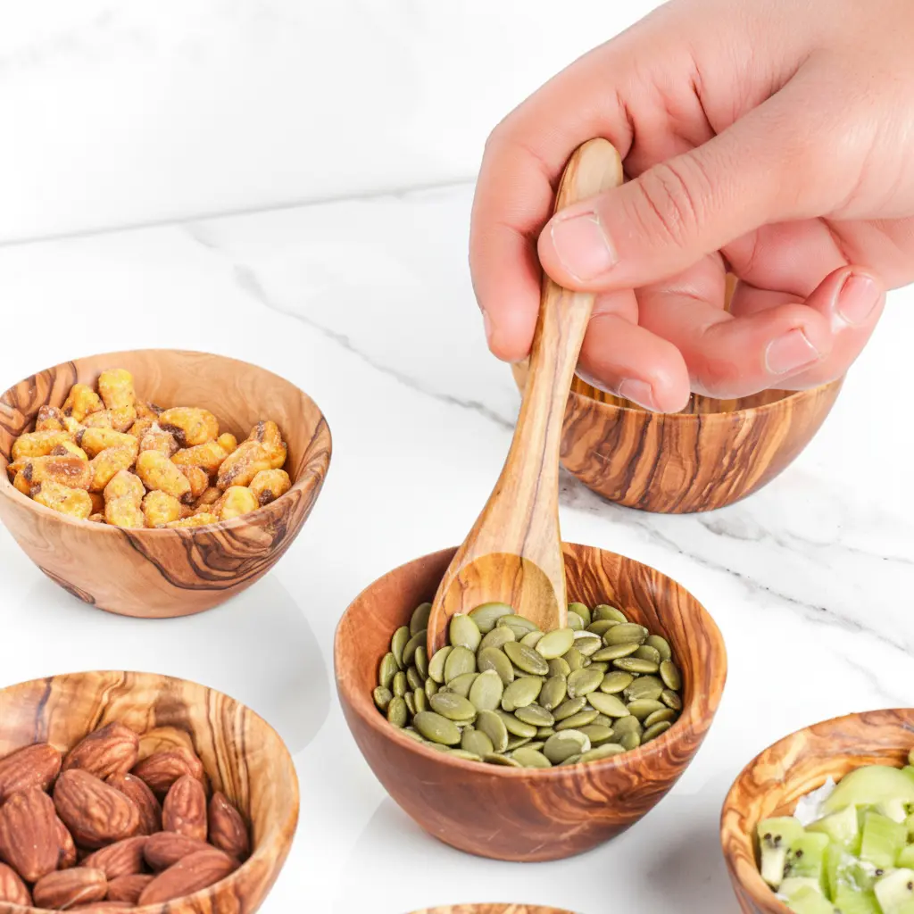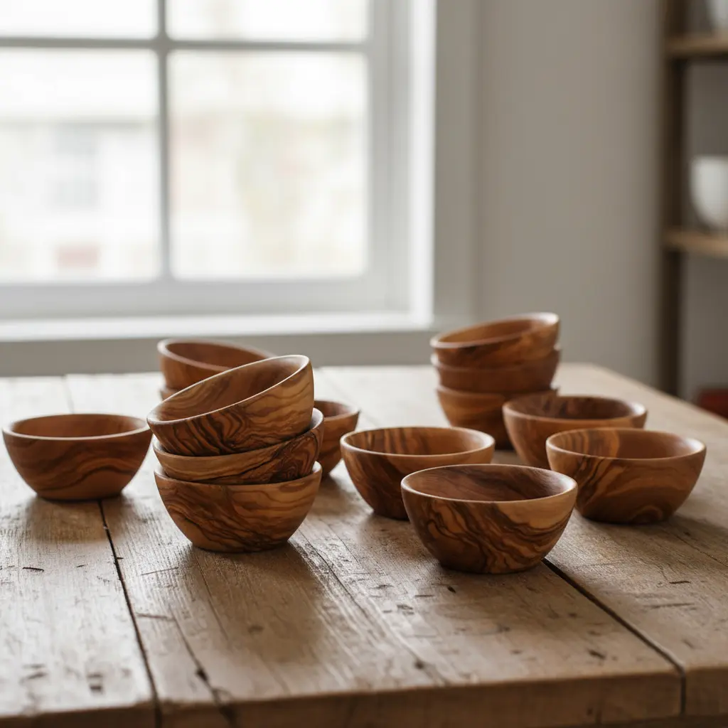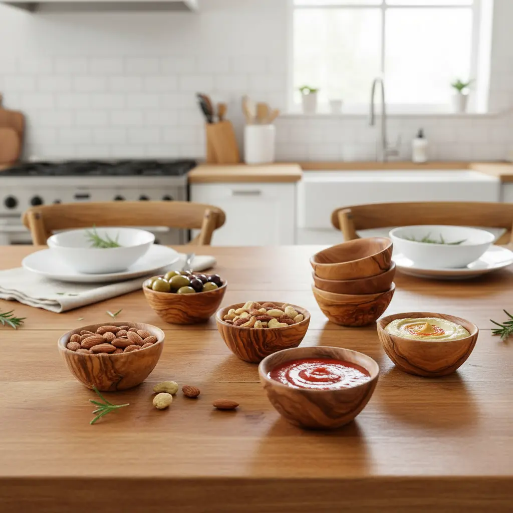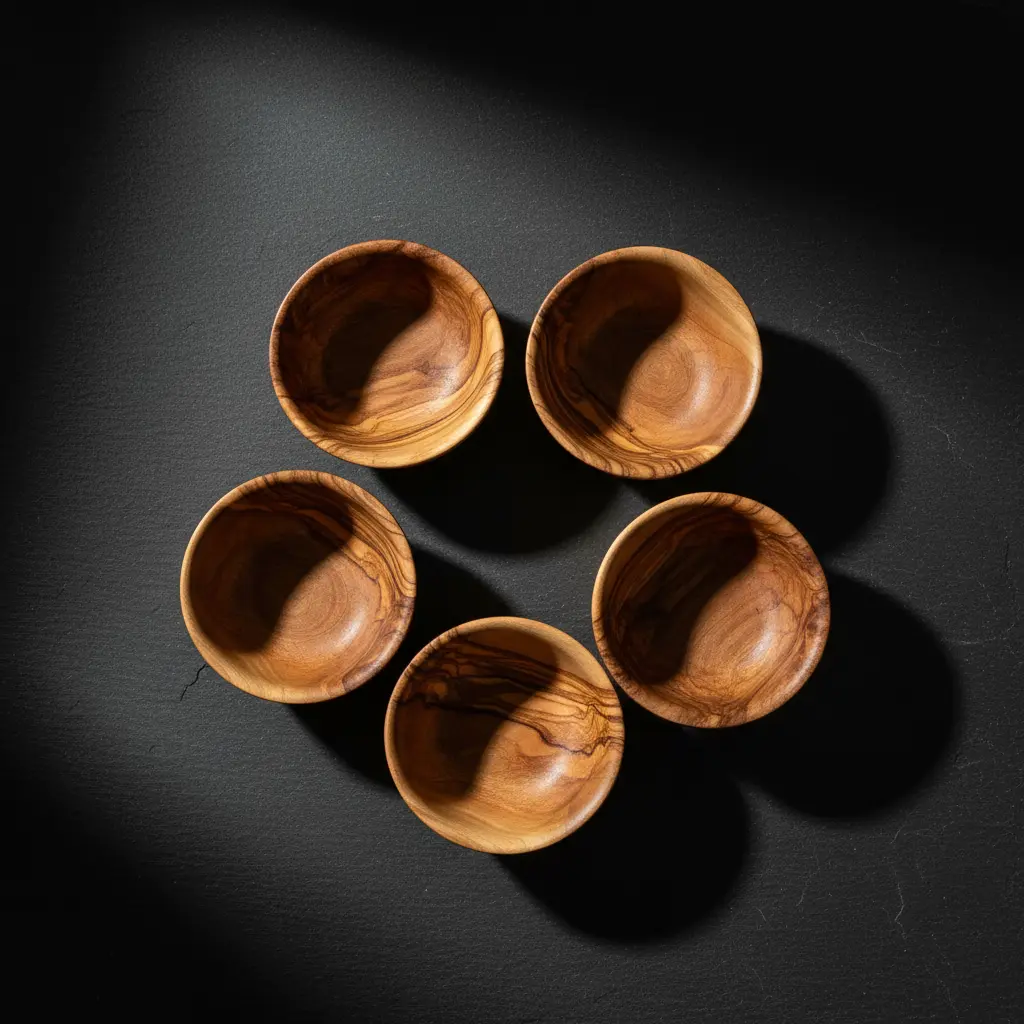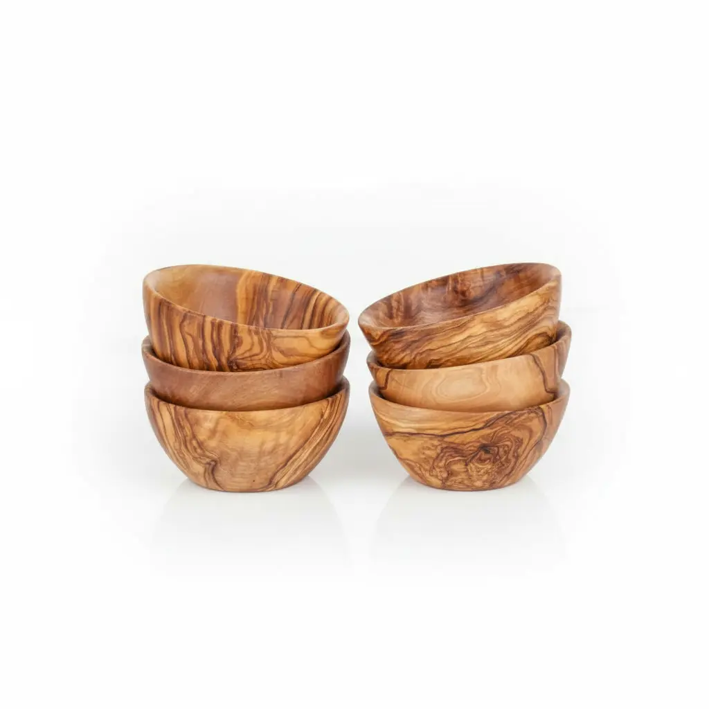 Artisraw presents exquisitely handcrafted olive wood mini bowls, perfect for enhancing your home decor and kitchen functionality. Each bowl is uniquely carved from sustainable olive wood, showcasing beautiful natural grain patterns that make every piece one-of-a-kind. These versatile bowls combine rustic Mediterranean charm with practical everyday use, featuring a food-safe finish that ensures both safety and durability for all your serving and organizing needs.