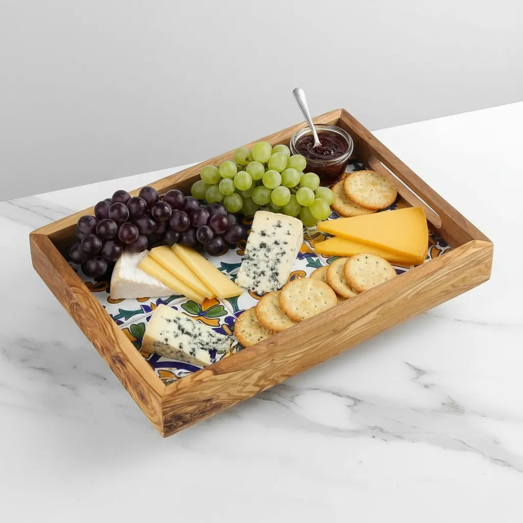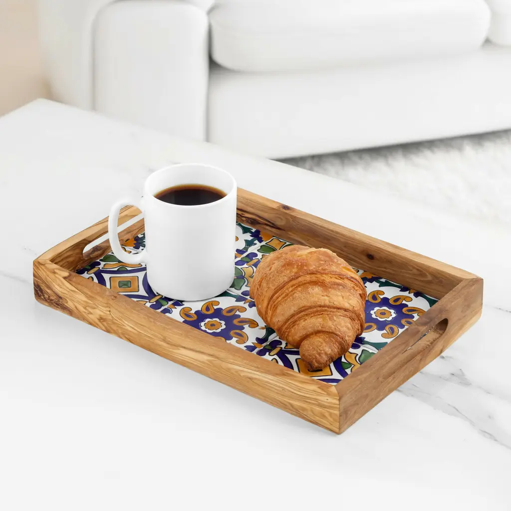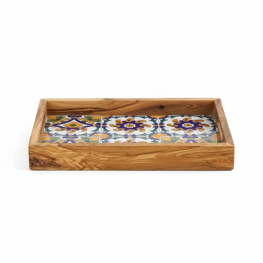 The handcrafted construction of this olive wood and ceramic tray ensures it will be a favorite for years to come. Each piece is carefully made to highlight the natural characteristics of the materials while providing functional utility. The tray's sturdy build and timeless design make it a worthwhile addition to your home decor collection, blending practicality with artistic expression.