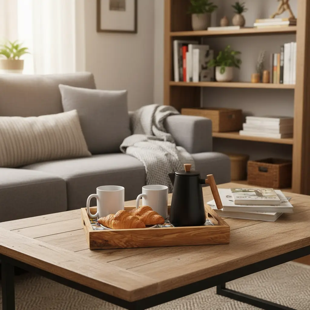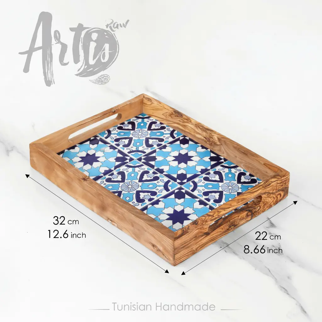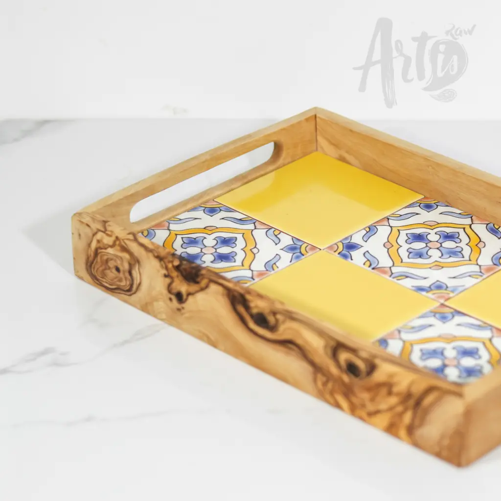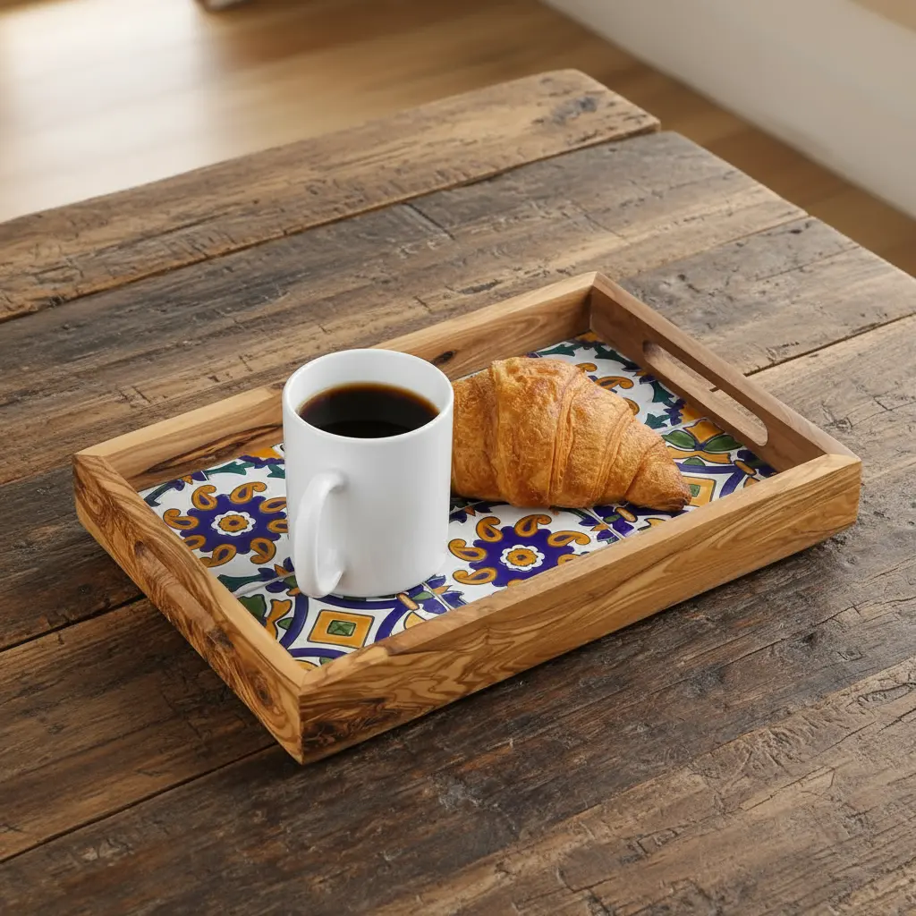 The handcrafted construction of this olive wood and ceramic tray ensures it will be a favorite for years to come. Each piece is carefully made to highlight the natural characteristics of the materials while providing functional utility. The tray's sturdy build and timeless design make it a worthwhile addition to your home decor collection, blending practicality with artistic expression.