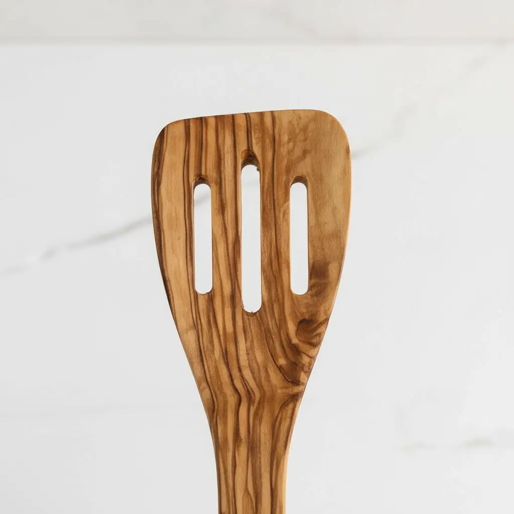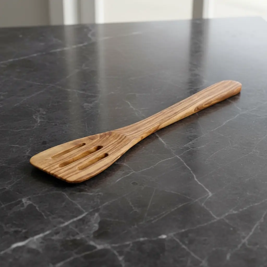 This beautiful slotted spatula is handmade from solid olive wood, combining artisanal craftsmanship with practical kitchen function. Each piece showcases the natural grain and character of olive wood, making every spatula unique. The durable construction ensures this kitchen tool will withstand daily use while maintaining its elegant appearance. Crafted with attention to detail, this spatula represents the perfect blend of traditional woodworking techniques and modern kitchen needs.