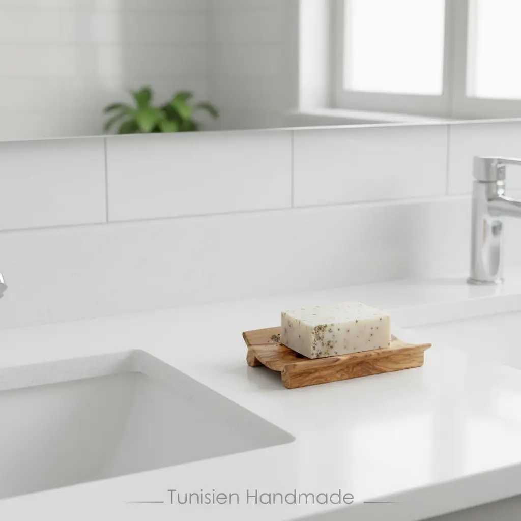 This exquisite soap dish is meticulously handcrafted from natural Tunisian olive wood, showcasing the unique grain patterns and warm tones of this sustainable material. Each piece is one-of-a-kind, featuring the natural variations that make olive wood so prized among artisans. The wood's inherent antibacterial properties ensure a hygienic surface for your daily use, while its durability promises years of reliable service in your bathroom or kitchen.