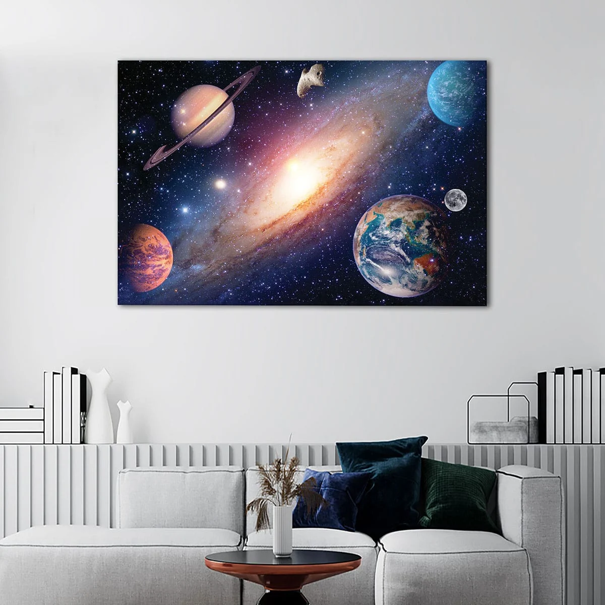 Available in 1 panel, 3 panels, or 5 panels, this Planets and Stars wall art is perfect for any room, including your living room, hallway, kids room, or dining room. You can choose from a variety of sizes, from small to oversized canvas prints, to fit your unique space.