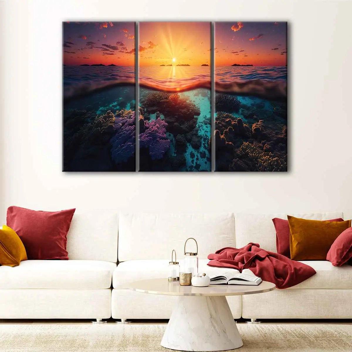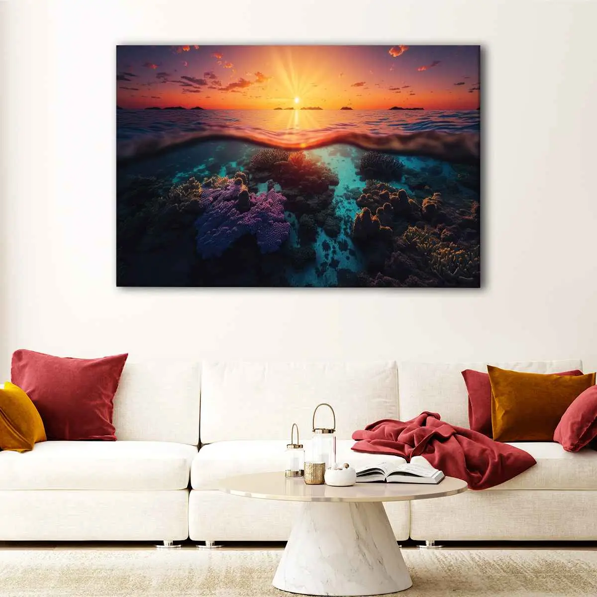 Our canvas art is available in a variety of sizes, from compact to large, making it perfect for any room in your home. Whether you're looking to create a focal point in your living room, add a touch of elegance to your hallway, or bring some serenity to your bedroom, this stunning underwater sunset will undoubtedly leave a lasting impression.